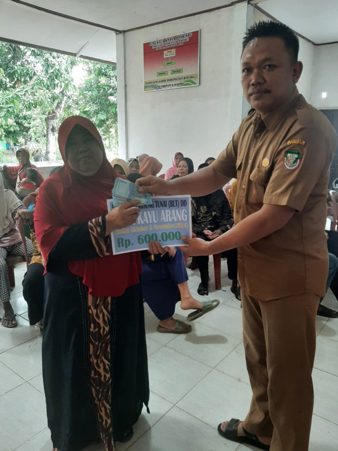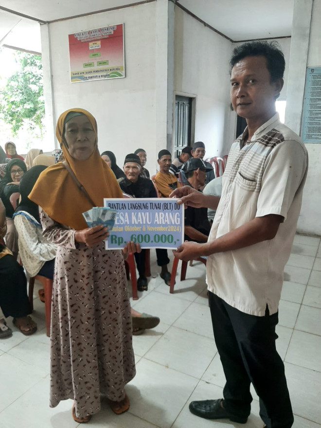 Senin 25 November 2024, bertempat di Balai Desa Kayu pembagian BLT DD berlangsung di Laksanakan dari pukul 09.00 wib sampai dengan selesai.Pemerintah Desa Kayu Arang melakukan kegiatan bantuan langsung tunai Dana Desa (BLT DD) di salurkan secara tunai ke 55 keluarga penerima manfaat (KPM), dan setiap KPM masing masing menerima bantuan sebesar Rp. 300.000 perbulan, untuk bulan oktober dan november dengan total yang di terima sebesar Rp. 600.000 setiap KPM.